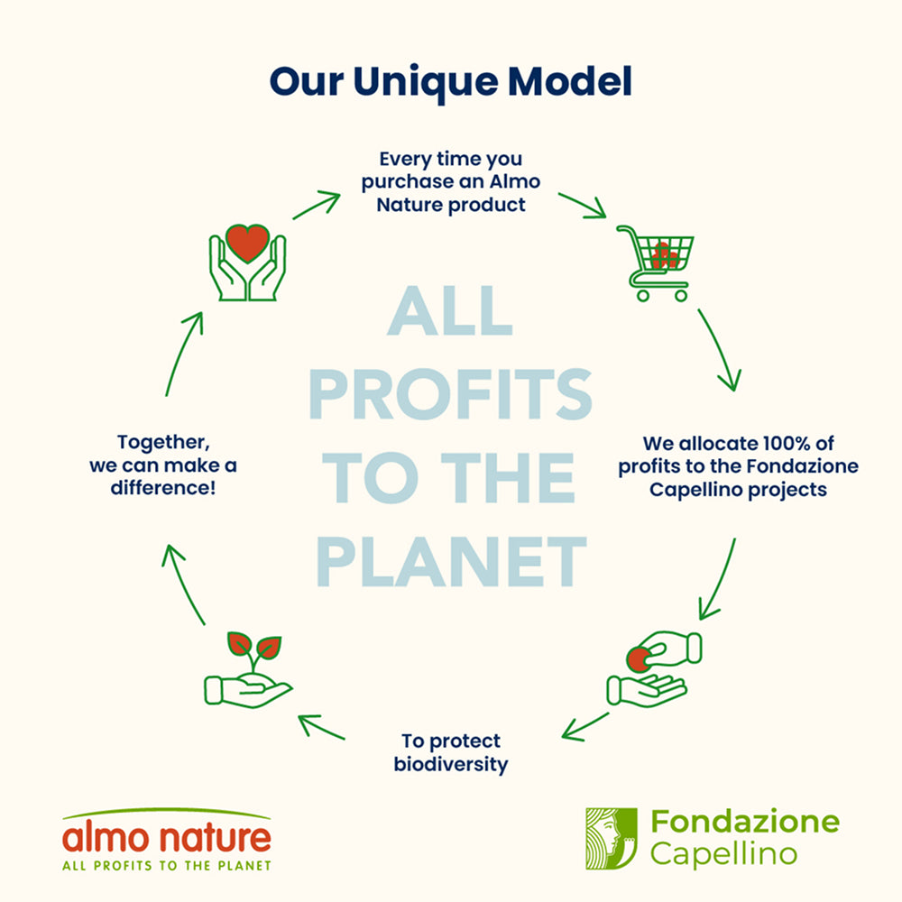 Buy Almo Nature for a good cause In 2018, owners Lorenzo and Pier Giovanni Capellino donated Almo Nature to Fondazione Capellino, a foundation that protects cats, dogs and nature through various projects. Now, all of Almo Nature's profits are used to fund the foundation's projects—which means that you directly support these projects whenever you buy Almo Nature products!
