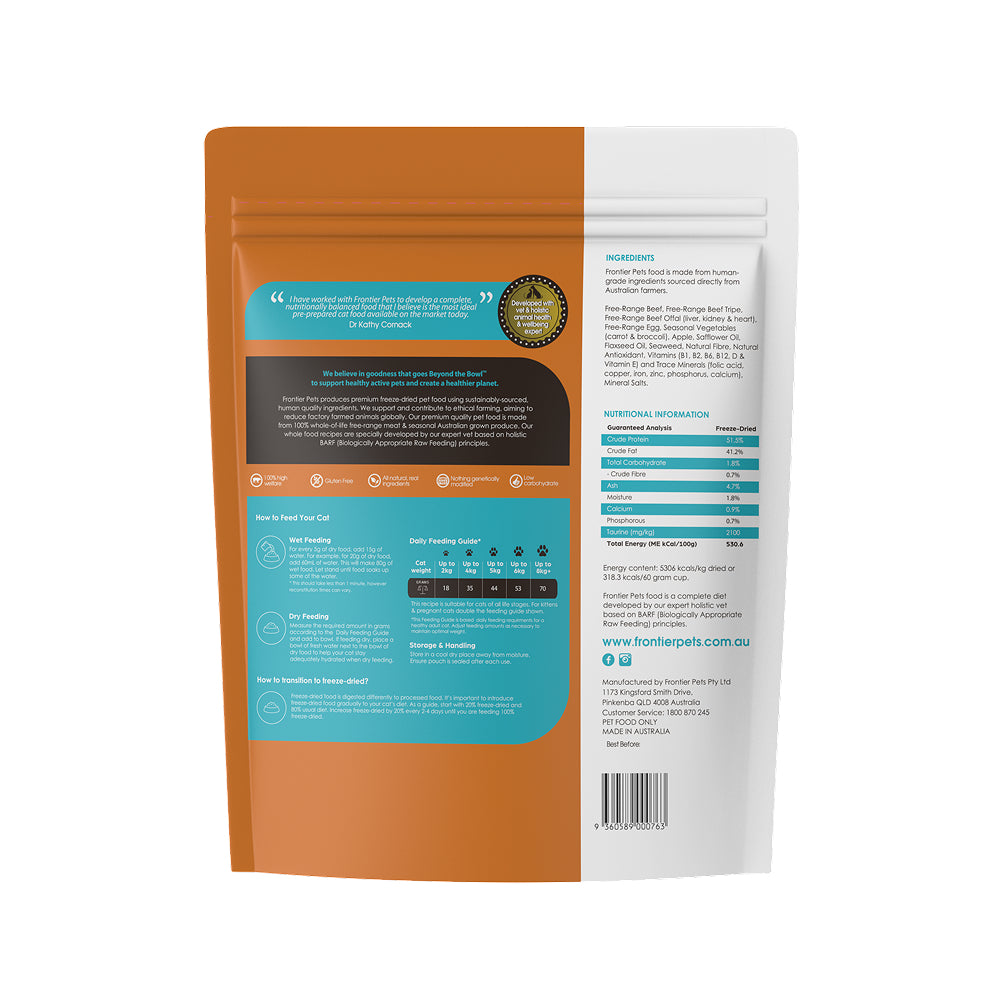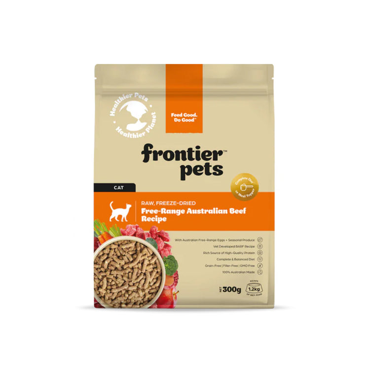 Frontier Freeze-Dried Free-Range Grass Fed Beef Cat Food provides cats with a biologically appropriate raw diet made from human grade ingredients sourced from sustainable Australian farms. This convenient freeze dried format preserves nutrients, flavor, and enzymes for optimal feline health.