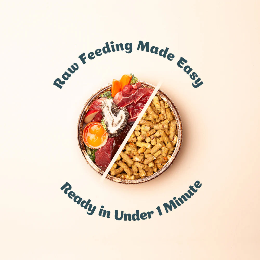 Free range, grass fed beef delivers high protein and essential amino acids for growth, muscle health, and energy. Offal such as liver, kidney, and heart provide natural vitamins and minerals, while green tripe supports digestive health. Added free range eggs, organic vegetables, and apples boost nutrient density. Safflower oil, flaxseed oil, and seaweed provide essential fatty acids, antioxidants, and natural fiber.