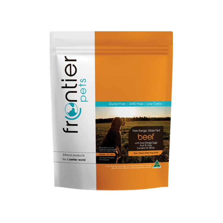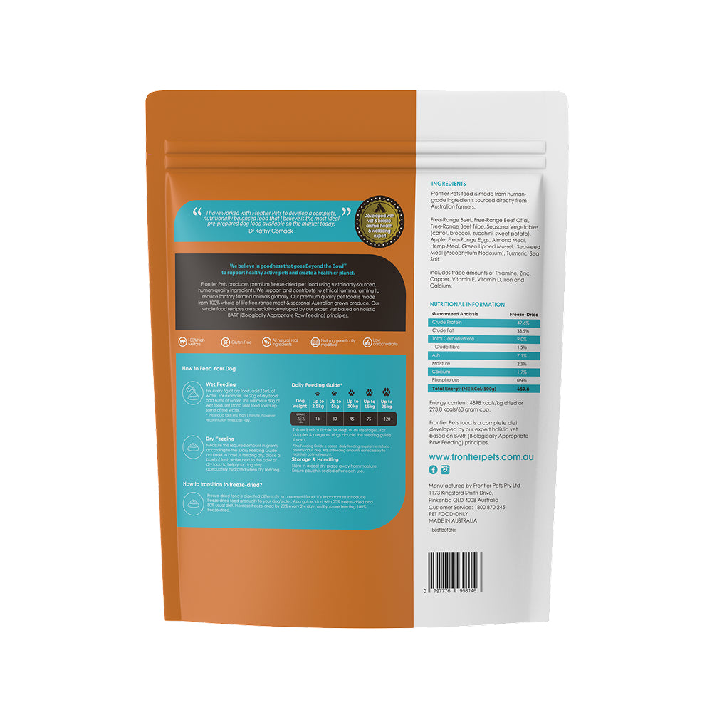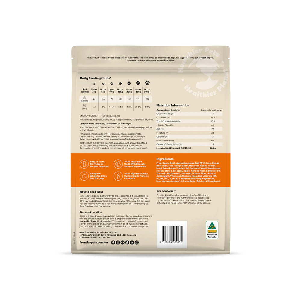 Frontier Freeze-Dried Free-Range Grass Fed Beef Dog Food is crafted with ethically sourced beef and organic produce from sustainable Australian farms. This premium human grade recipe provides a biologically appropriate raw diet for dogs in a convenient freeze dried format.