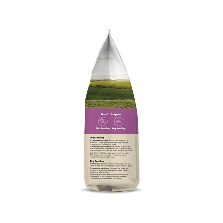 Freeze Dried Free Range Grass Fed Lamb & Fish Dog Food 採用自由放養草飼羊肉及三文魚,搭配有機蔬果製成,提供完整均衡的天然營養,以冷凍乾燥技術保存養分與風味。