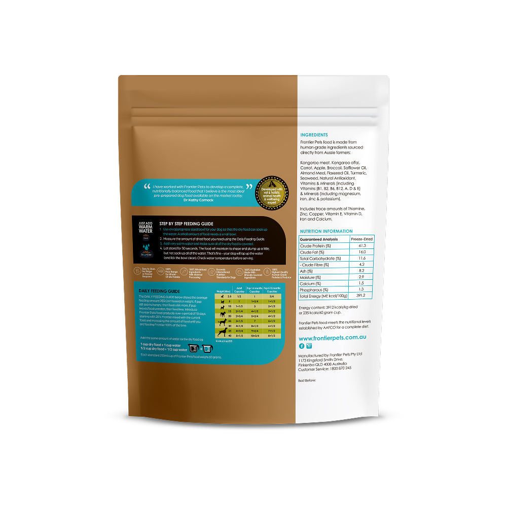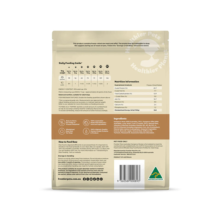Frontier Freeze-Dried Raw Wild Kangaroo Dog Food is crafted with ethically sourced kangaroo meat and organic produce from sustainable Australian farms. This premium human-grade recipe is designed to provide dogs with a biologically appropriate raw diet in a convenient freeze-dried format.