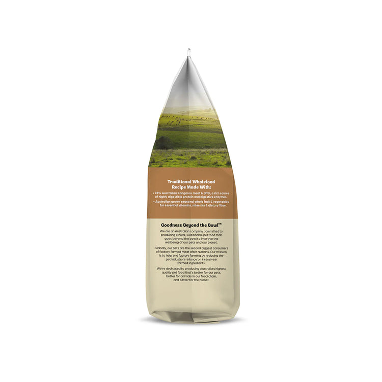 Freeze Dried Raw Wild Kangaroo Dog Food 採用澳洲自由放養袋鼠肉及有機蔬果製成,100% 人用級食材,來自可持續農場。這款優質配方提供最貼近天然的飲食方式,以冷凍乾燥技術保存營養與風味。