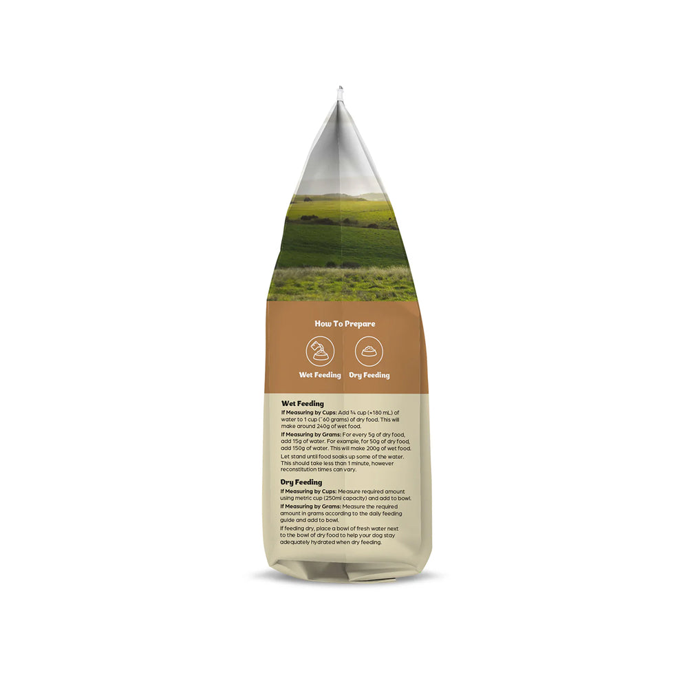 不含人工添加劑、抗生素、荷爾蒙與基因改造成分,支持動物福利與環境保護。冷凍乾燥技術讓飼養更方便,只需 20 秒加水即可享用。