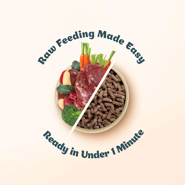 Each recipe includes raw meat, organs, cartilage, and tendons, combined with nutrient rich fruits, vegetables, seaweed, natural antioxidants, and a complete vitamin and mineral profile. Gently freeze-dried to preserve flavor and nutrients, this food requires no refrigeration and rehydrates in just 20 seconds.