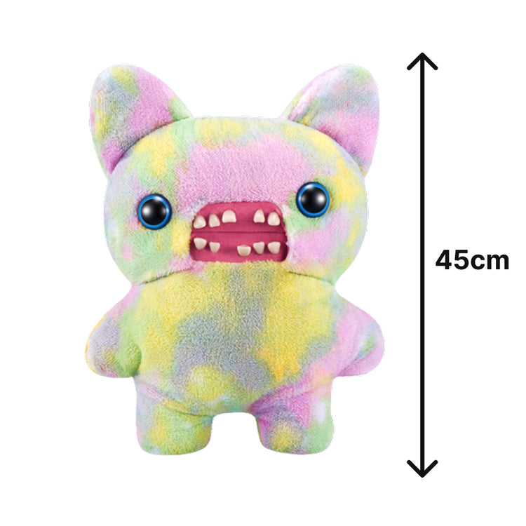- Fur Texture: Soft, fuzzy plush with multi-coloured tie-dye finish