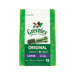 Support your furry sidekick's dental health with Greenies Regular Dental Dog Treats! These delicious original flavor dental dog treats are crafted with an irresistibly chewy texture that helps remove plaque and tartar. These natural dog treats are vet recommended for at-home oral health care because they help promote oral hygiene, freshen breath and contain highly soluble ingredients that are safe and easy for your pup to digest. Plus, you can feel extra confident knowing that these whisker-licking treats promote your canine companion's overall health with vitamins, minerals and other nutrients!