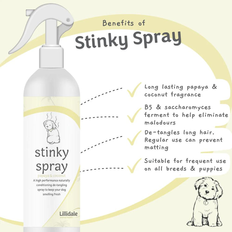 Just spray, comb, and leave—no rinsing needed. Whether after playtime, walkies, or a rainy day, Lillidale Stinky Spray keeps your dog smelling clean and feeling great.