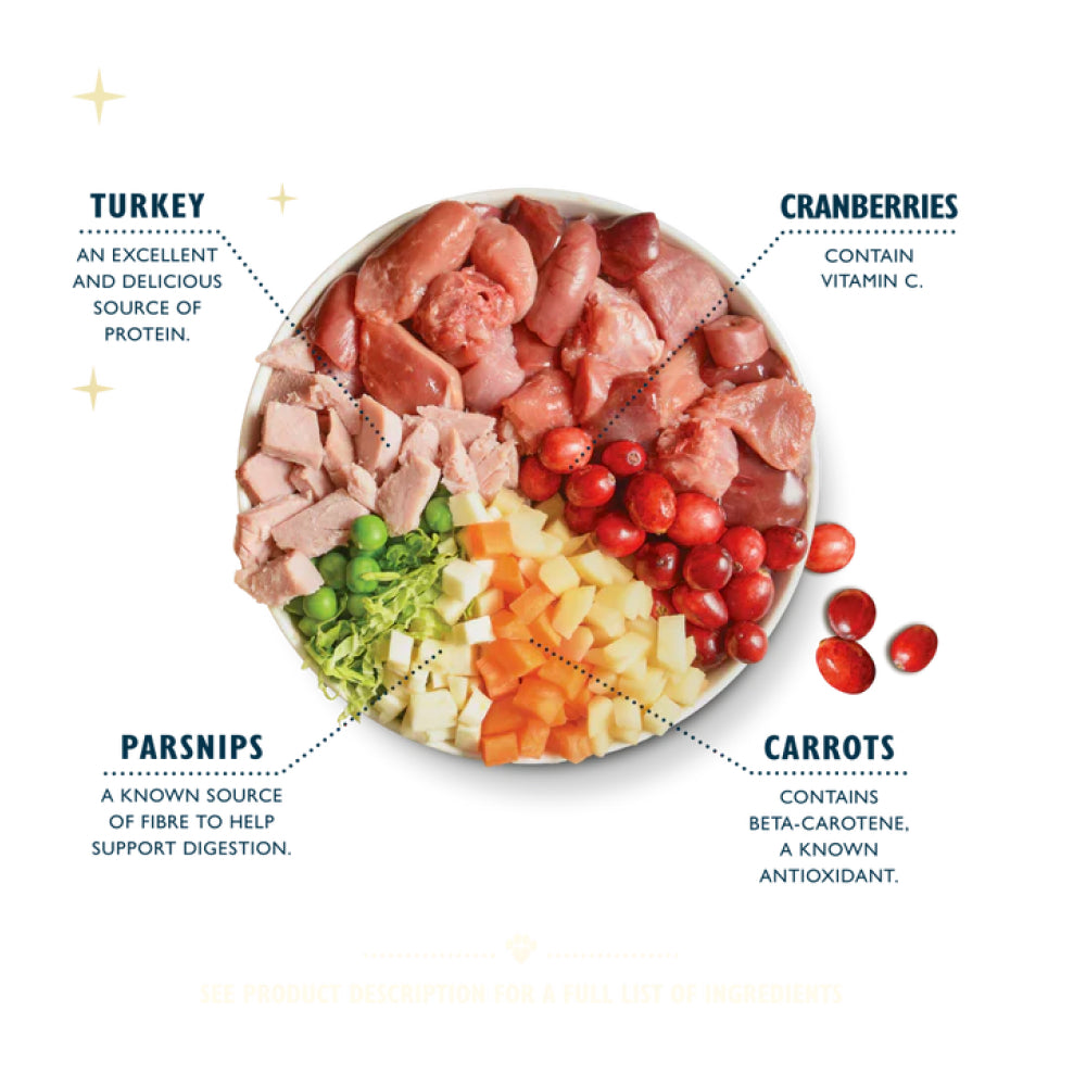 以50% 新鮮烹調的火雞肉製作,提供高品質、易消化且美味的蛋白質來源。