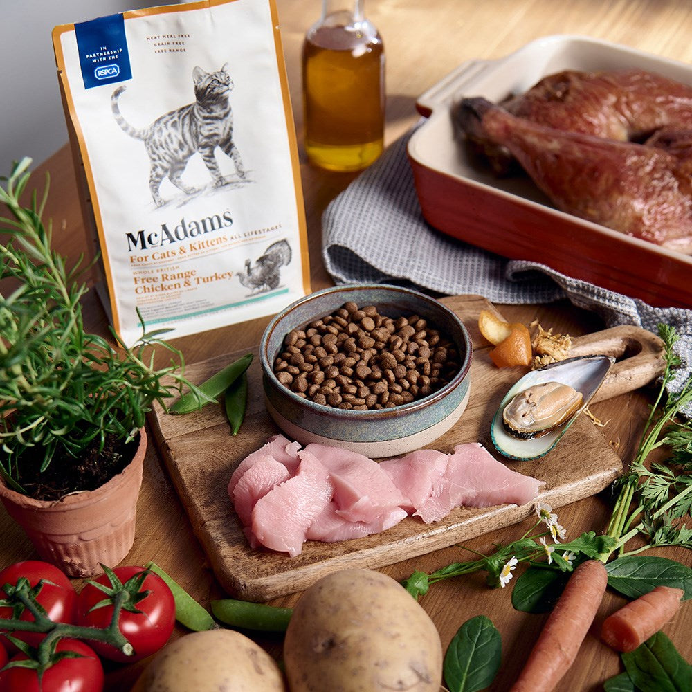 McAdams Chicken & Turkey Cat Dry Food is a complete and balanced dry food suitable for cats of all life stages, from kittens through to adult cats. This nutrient-rich recipe is made using whole British free-range chicken and freshly prepared free-range turkey, providing high-quality animal protein to support overall health and vitality.