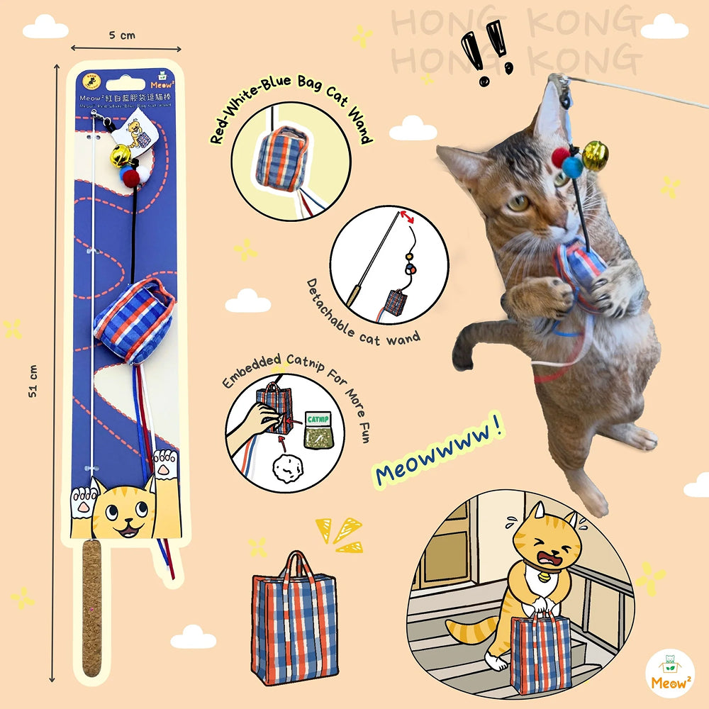 Meow² Red White Blue Bag 柔軟逗貓棒以香港經典紅白藍袋為靈感,充滿本地情懷,是既可收藏又能讓貓咪享受追打樂趣的懷舊玩具。