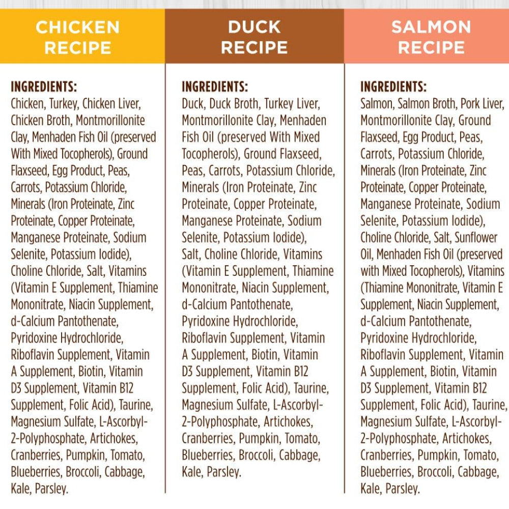 Salmon, Salmon Broth, Pork Liver, Montmorillonite Clay, Ground Flaxseed, Egg Product, Peas, Carrots, Potassium Chloride, Minerals (Iron Proteinate, Zinc Proteinate, Copper Proteinate, Manganese Proteinate, Sodium Selenite, Potassium Iodide), Choline Chloride, Salt, Sunflower Oil, Menhaden Fish Oil (preserved with Mixed Tocopherols), Vitamins (Thiamine Mononitrate, Vitamin E Supplement, Niacin Supplement, d-Calcium Pantothenate, Pyridoxine Hydrochloride, Riboflavin Supplement, Vitamin A Supplement, Biotin, Vitamin D3 Supplement, Vitamin B12 Supplement, Folic Acid), Taurine, Magnesium Sulfate, L-Ascorbyl-2-Polyphosphate, Artichokes, Cranberries, Pumpkin, Tomato, Blueberries, Broccoli, Cabbage, Kale, Parsley.
