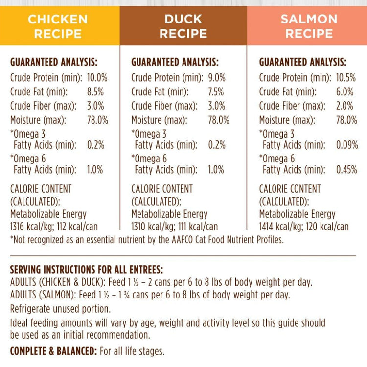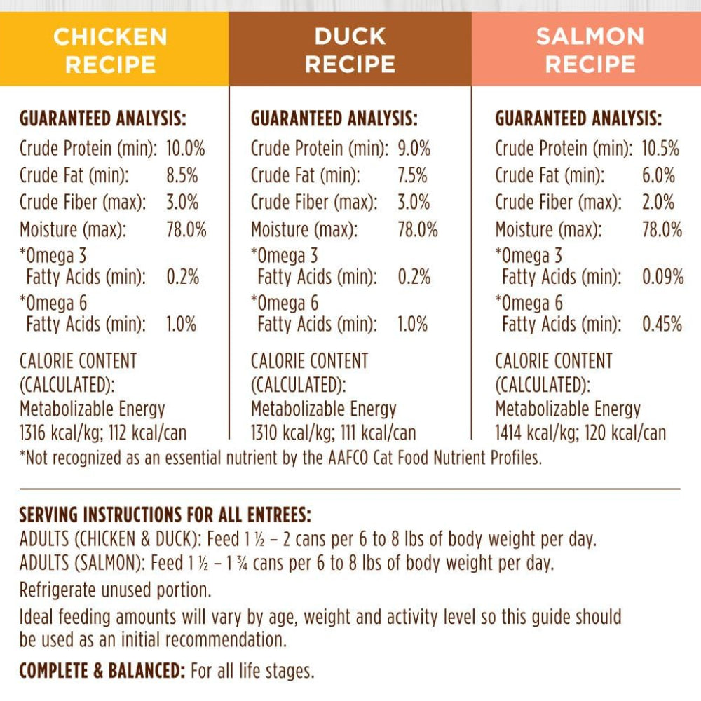 - 成年貓(雞肉 & 鴨肉):每 6–8 磅體重,每日餵食 1½–2 罐