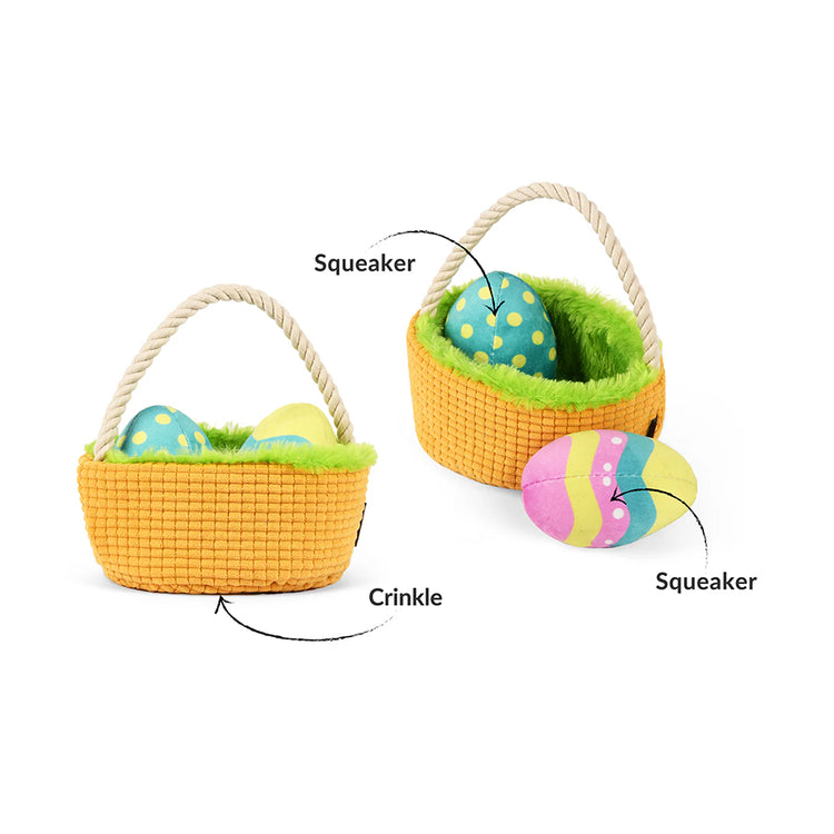 - Play Design: Easter basket-inspired toy with two squeaky Easter eggs tucked inside for interactive fun
