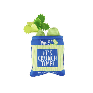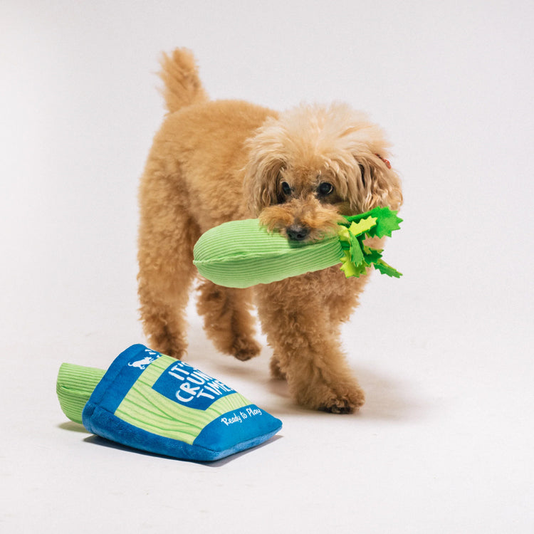 - Play Design: 3-in-1 interactive toy with pop-out squeaky plush celery stalks inside a crinkly bag