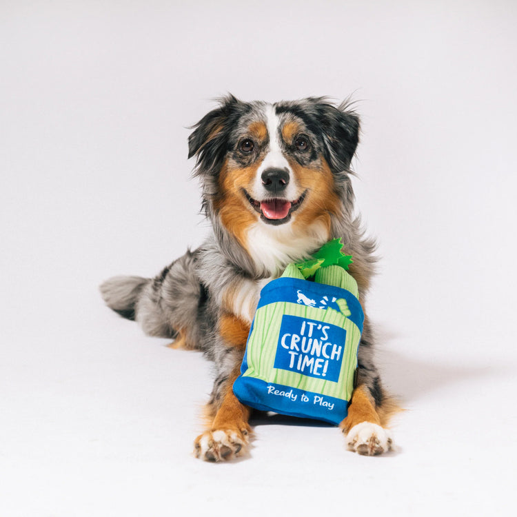 Specially suited for medium to large dogs, the Crunch Bunch 3-in-1 encourages mentally engaging play that taps into natural foraging instincts. Dogs can pull the plush celery stalks from the crinkly outer bag, making playtime feel more rewarding, interactive, and stimulating. It is a fun way to give your pup both physical activity and mental enrichment in one adorable veggie-inspired toy set.