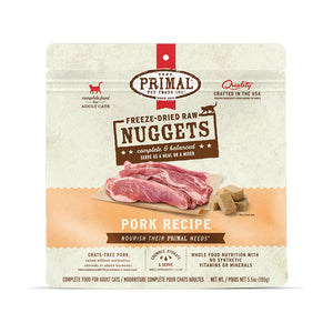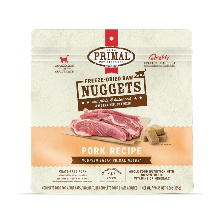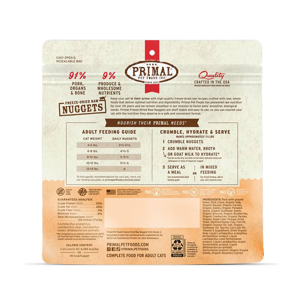 These Primal nuggets are simple to feed - simply add the directed amount of water and let them rehydrate before feeding to your furry friend. The breakdown of ingredients in this recipe works out to be 91% fresh pork (including bones) and 9% organic produce and beneficial supplements.