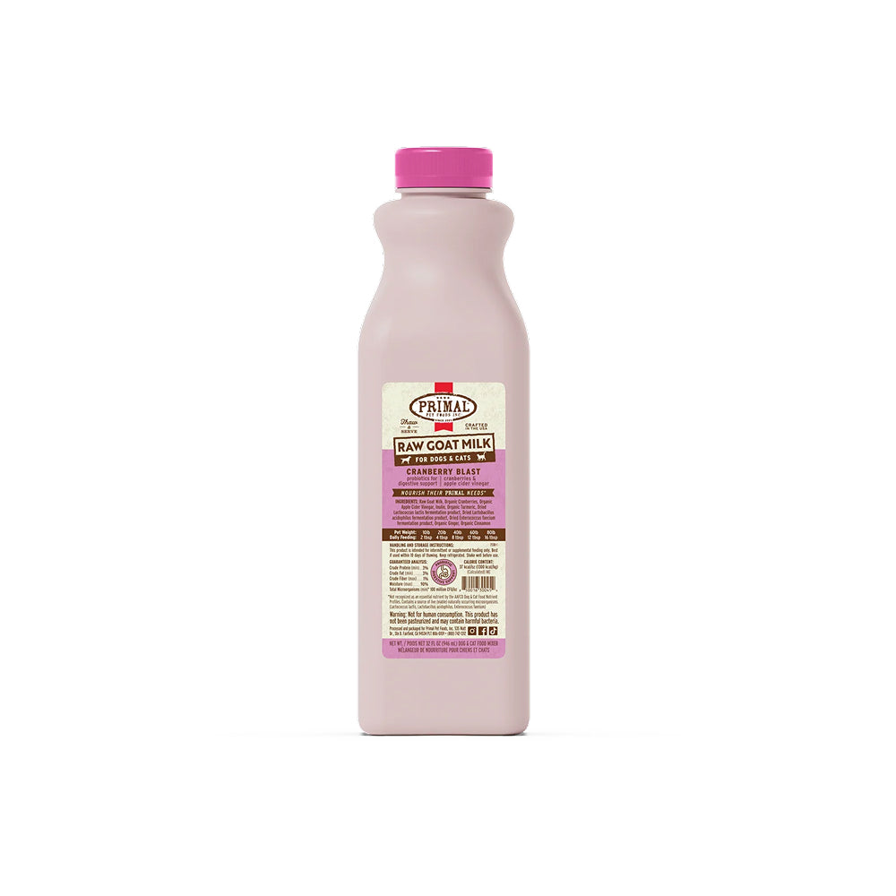 Primal Cranberry Blast Raw Goat Milk contains no synthetic vitamins or minerals and is free from corn, wheat, soy, grain, legumes, lentils, and gluten. Crafted in the USA, it comes in a 32 ounce resealable bottle for convenient storage and serving.