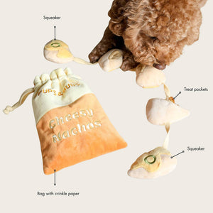 Treats can be tucked inside the plush pouch or hidden within each chip piece, encouraging dogs to use their noses, paws, and problem-solving skills to uncover every surprise. Whether your pup is digging into the bag or exploring each detachable nacho, the toy helps support natural foraging instincts while keeping playtime mentally stimulating and rewarding.