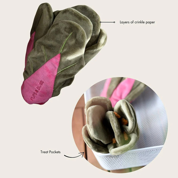 這款瑞士甜菜嗅聞毛絨玩具猶如剛從嗅聞花園中採摘回來,專為喜歡探索和尋找零食的狗狗而設。玩具以瑞士甜菜為靈感,設有柔軟層疊的「葉片」結構,每片葉子都可摺疊和捲起,方便將零食藏於其中,讓每次嗅聞遊戲都充滿驚喜和挑戰。