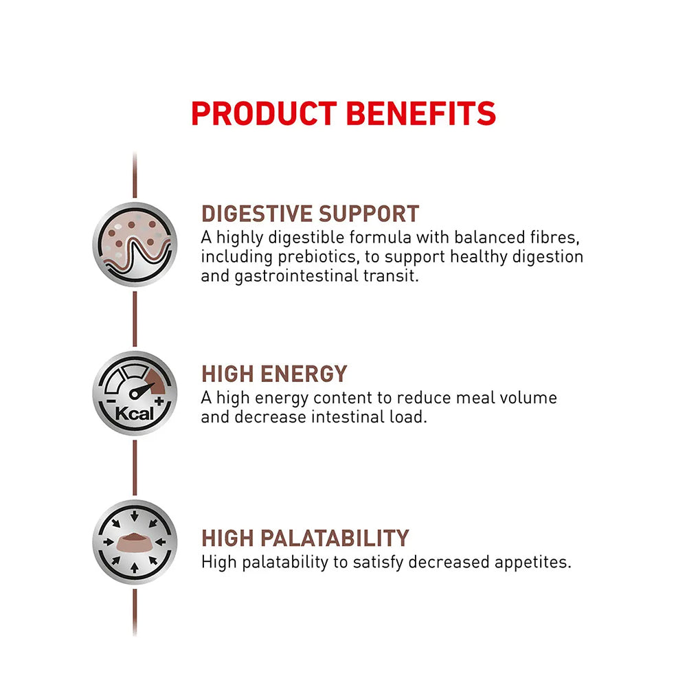 高能量密度設計可減少進食份量,減輕腸道負擔,同時提供充足熱量。添加益生元及奧米加3脂肪酸,幫助維持腸道菌群平衡並舒緩腸胃。