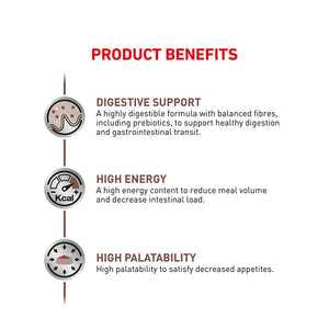 Its high energy density allows smaller portions to reduce the intestinal workload while providing complete and balanced nutrition. Selected prebiotics and omega-3 fatty acids help maintain a healthy intestinal microbiome and soothe the digestive tract.