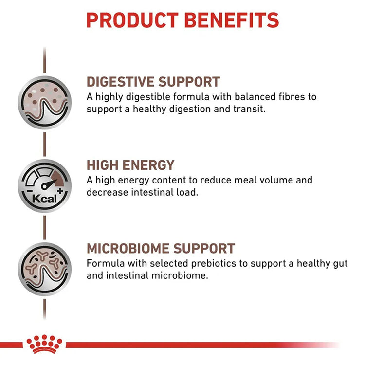 Royal Canin VHN Gastrointestinal Dog Can is a veterinary-exclusive wet diet formulated to support dogs with acute and chronic digestive disorders. It is suitable for dogs suffering from diarrhoea, inflammatory bowel disease (IBD), gastritis, colitis, maldigestion, malabsorption, small intestinal bacterial overgrowth (SIBO), exocrine pancreatic insufficiency (EPI), reduced appetite, and during re-feeding after surgery.