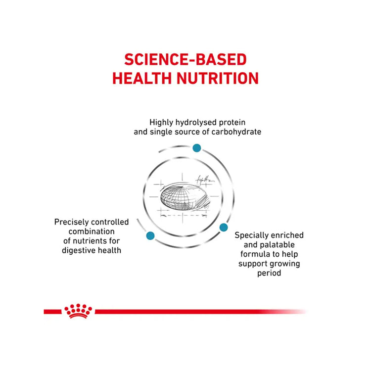 This diet is suitable for puppies with food reactions, gastrointestinal or dermatological signs of intolerance, or undergoing elimination trials. Always use under veterinary supervision and transition gradually over 7–10 days.
