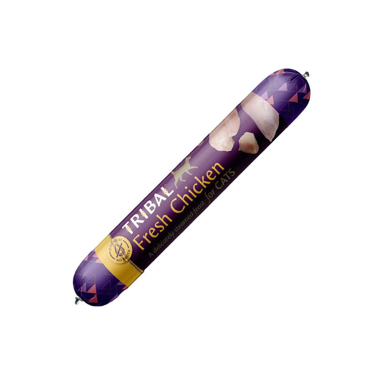 Tribal Fresh Chicken Sausage is a gently cooked, grain-free complete wet food formulated for adult cats aged 1 year and above. Made with 70% fresh chicken, this simple and natural recipe delivers high-quality, easily digestible protein to support overall health while being ideal for cats with sensitive digestion or food intolerances.