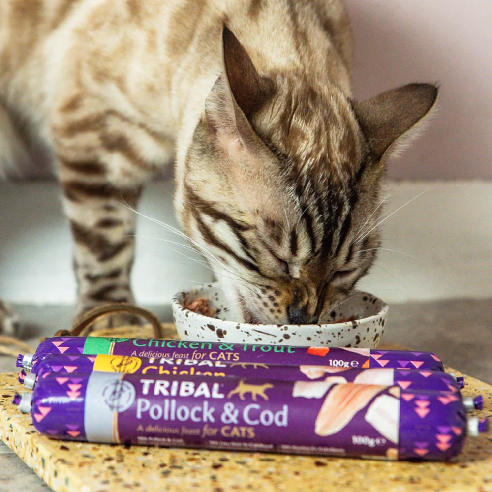 Tribal Fresh Pollock & Cod Sausage is a gently cooked, grain-free complete wet food formulated for adult cats using simple, natural, and hypoallergenic ingredients. Carefully steamed to preserve nutrients and flavour, this fish-based sausage offers a highly palatable texture that supports daily health and wellbeing.