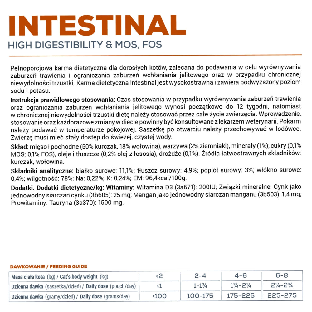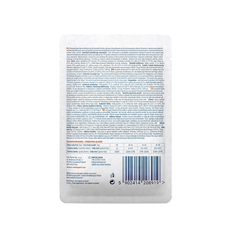 Support your cat’s digestive health with the Vet Expert Intestinal Cat Pouch—a complete and balanced wet food designed for cats with absorption issues, digestive sensitivities, or chronic pancreatic insufficiency. This diet is carefully formulated with easily digestible chicken and beef proteins to ensure maximum nutrient absorption and muscle mass stability.