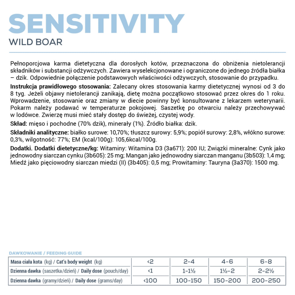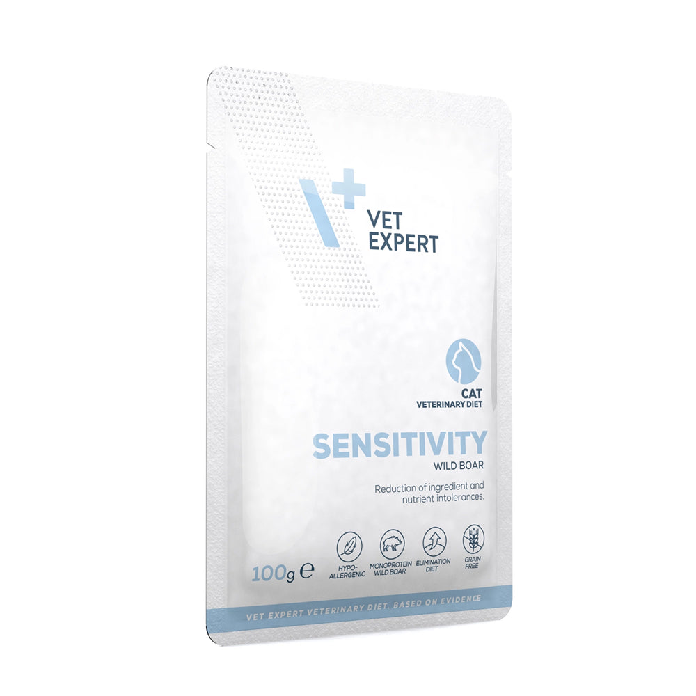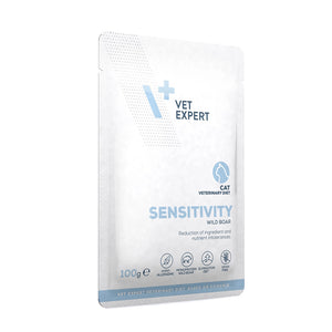 Designed for cats with food sensitivities or ingredient intolerances, the Vet Expert Sensitivity Cat Pouch is a complete and balanced wet food formulated to reduce the risk of adverse food reactions. With wild boar as the only animal protein source, this monoprotein diet supports elimination trials and long-term maintenance for cats with dietary allergies.