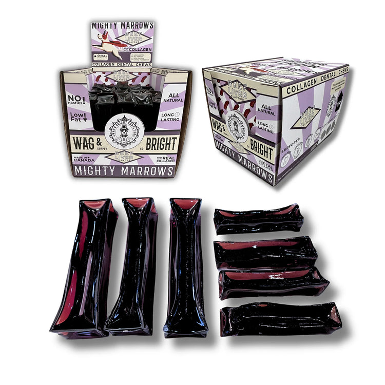 Wag & Bright 牛肝骨膠原潔齒棒來自 Mighty Marrows 系列,係一款美味又營養嘅潔齒小食,幫助維持狗狗口腔健康,仲帶有 irresistible 嘅牛肝香味。每支超耐咬潔齒棒專為自然清潔牙齒、減少牙垢、清新口氣而設,同時對狗狗牙齦溫和護理。