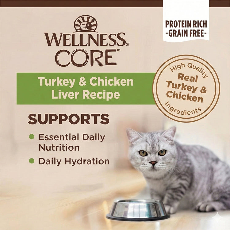 Wellness Core系列濕糧配方以來自優質肉類和內臟的蛋白質為主要營養成分,提供與貓咪原始肉食習慣相近的營養,以貓咪吃得健康又開心。