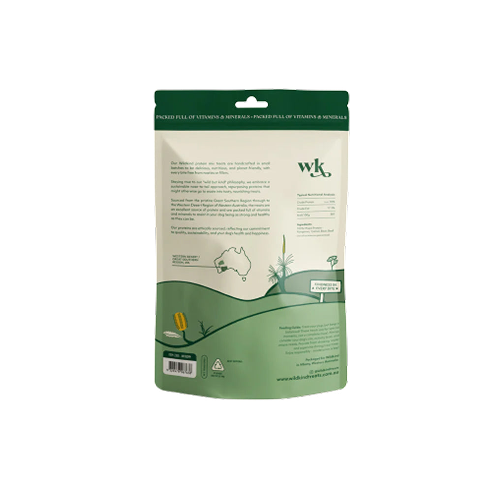 Wildkind 風乾狗狗零食於澳洲西南部製作,嚴選 100% 澳洲單一蛋白質,並以溫和風乾方式保留天然營養與濃郁肉香。配方純淨,不含穀物、填充物或人工添加劑,為狗狗提供高蛋白、自然的美味享受。